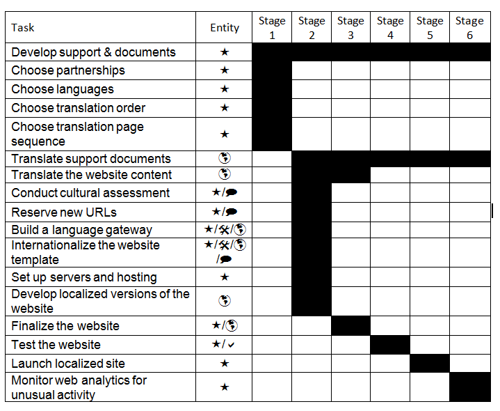 The GILT (Globalization, Internationalization, Localization, Translation) framework is the industry standard for outlining the process of producing a global product – in this case, a corporate website. Testing and Support stages are appended to ensure that maintenance of the new multilingual site is given the proper importance in the process, establishing the following new acronym: