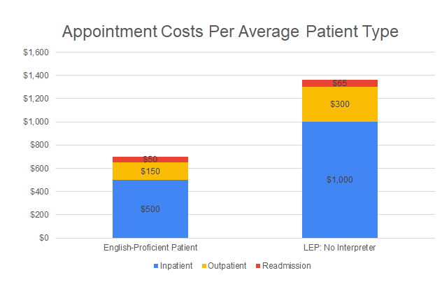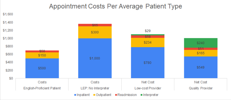 To start, the average cost per English proficient (EP) patient appointment is $700, compared to an LEP patient, which is $1,365. Not all costs may be relevant to every organization. For example, adjustments can be made for organizations that do not handle inpatients. This will be considered below.