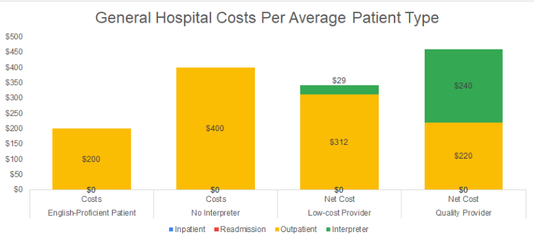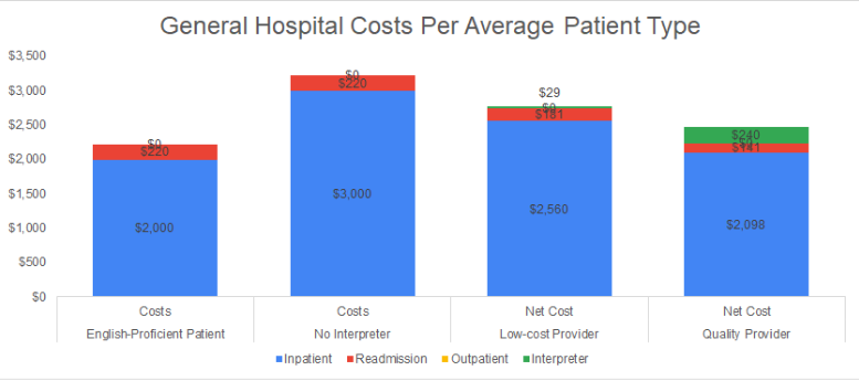 The average EP patient costs a hospital $700 per appointment. LEP patients increase the average inpatient, outpatient and readmission costs by a total of $665 for a net cost of $1,365. When an interpreter is used, these same costs decline by $293 to $600 (depending on the LCP and HQP scenario, respectively), for a net cost of $1,072 to $765. In other words, interpreting costs would need to be between $293 and $600 in order for the effect of the interpreter to be negated, and for their costs to break-even against their benefits. Furthemore, there are additional benefits of using an interpreter that are not measured, such as improved patient and medical staff satisfaction ratings and the medicare reimbursements associated with improved patient satisfaction. Finally, better communication between medical staff and patients improves treatment adherence, success rates and additional medicare reimbursements associated with improved readmission rates.